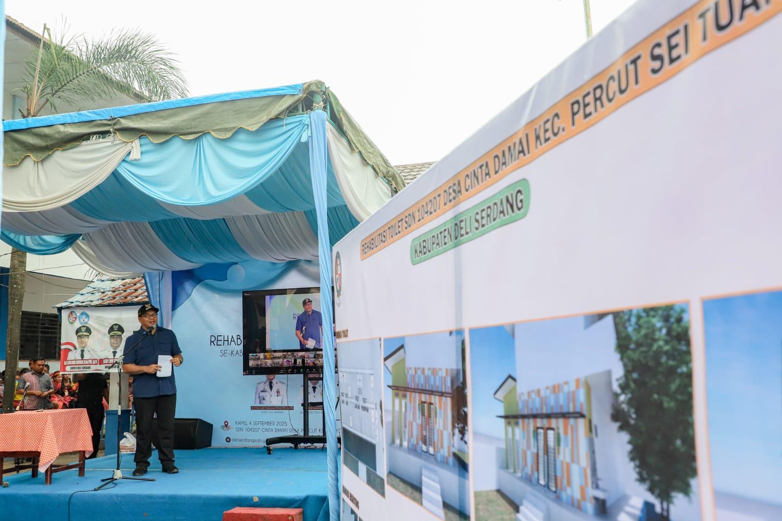 Sebagai langkah awal program ini, Pemkab Deli Serdang sempat melakukan kegiatan groundbreaking rehabilitasi toilet ini di SD Negeri 104207 Desa Cinta Damai Kecamatan Percut Seituan, Kamis (4/9/2025).