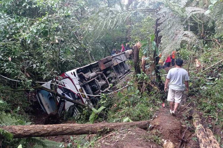 Bus pariwisata yang membawa rombongan wisatawan dari Kelurahan Manyaran, Kecamatan Semarang Barat, Kota Semarang, Jawa Tengah, masuk jurang