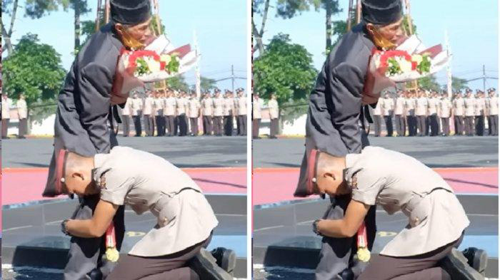 Saat Bripda Andi Sonjaya bersujud mencium kaki sang ayah yang bernama Udin Sudrajat. Profesi dari ayah Andi Sonjaya adalah seorang sopir angkot