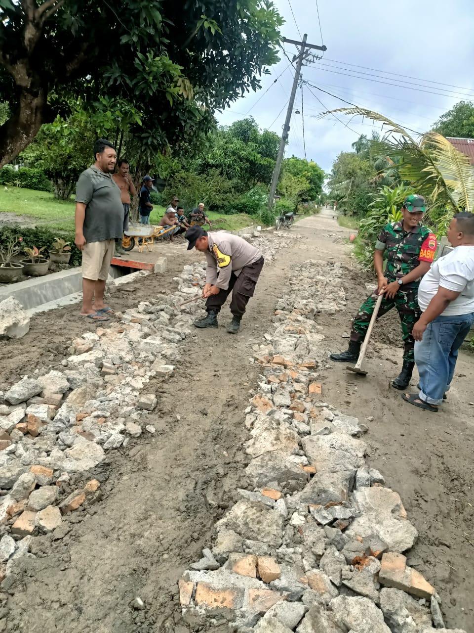 Aipda JButar Butar, Bhabinkamtibmas Polsek Bosar Maligas, bersama warga dan Tiga Pilar Plus bergotong royong memperbaiki jalan di Huta II.
