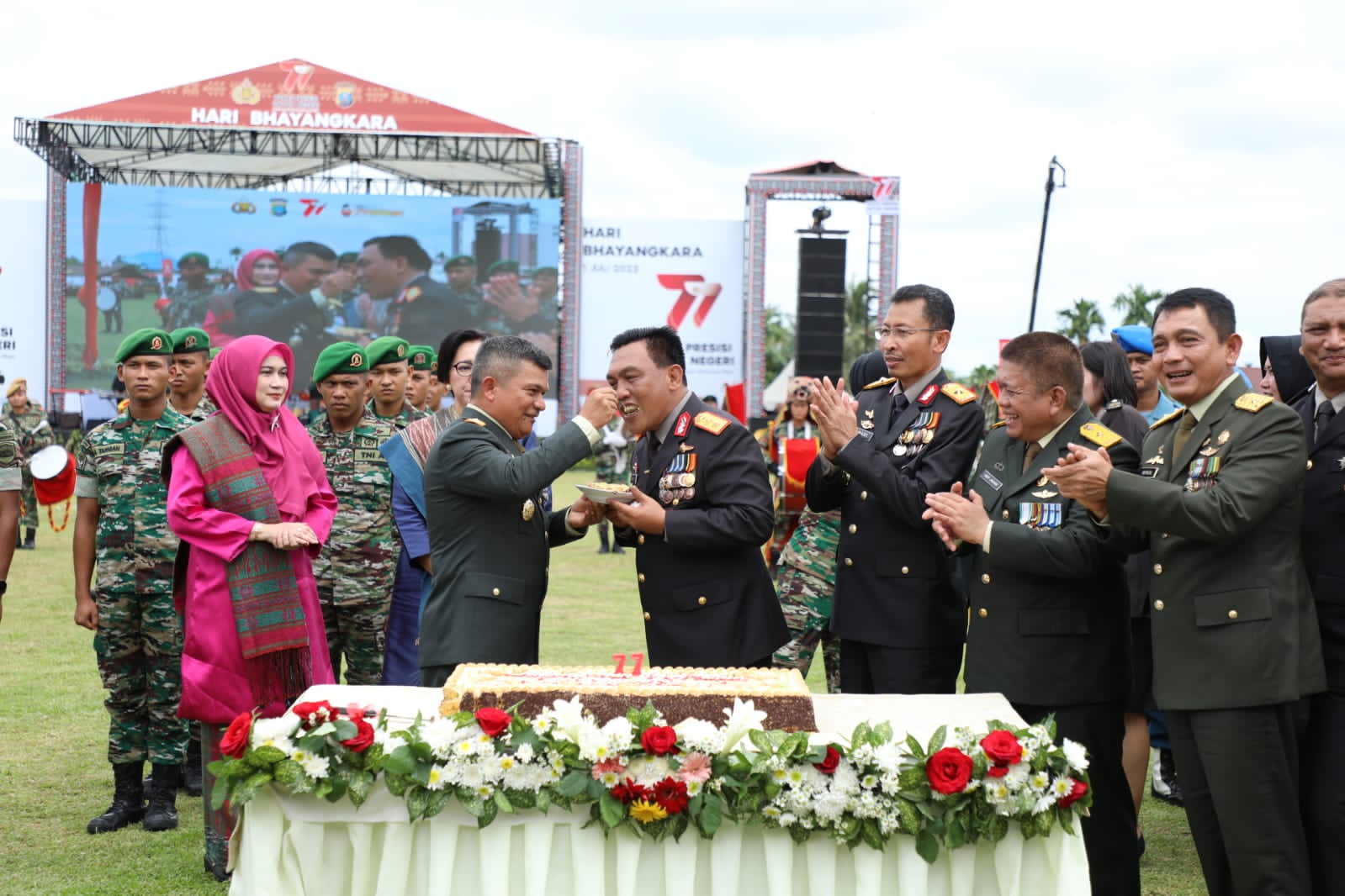 Kapolda Sumut Irjen Pol Panca Putra Simanjuntak diusuapi kue ulang tahun HUT Bhayangkara ke-77 oleh Pangdam I Bukit Barisan Mayjen TNI Daniel A Chard