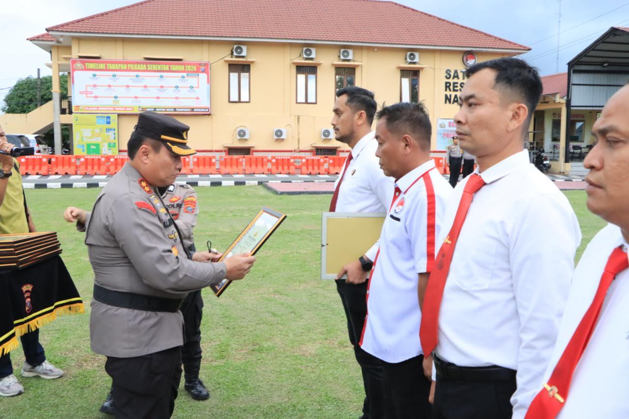 Kapolres Labuhanbatu, AKBP Dr. Bernhard L. Malau, S.I.K., M.H., memberikan penghargaan kepada personel berprestasi dalam apel kesiapan pengamanan