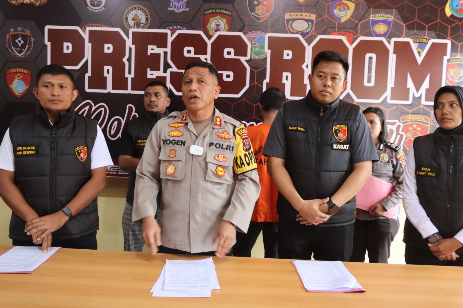 Kapolres AKBP Yogen Heroes Baruno S.H., S.I.K Pimpin konferensi Pers pengungkapan Kasus tindak pidana pencabulan dibawah umur, Senin (27/5/2034) di LT