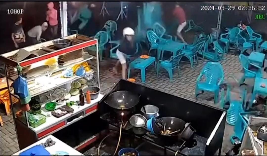 Kemudian, mereka juga terlihat menghancurkan kursi dan meja di warung makan tersebut.