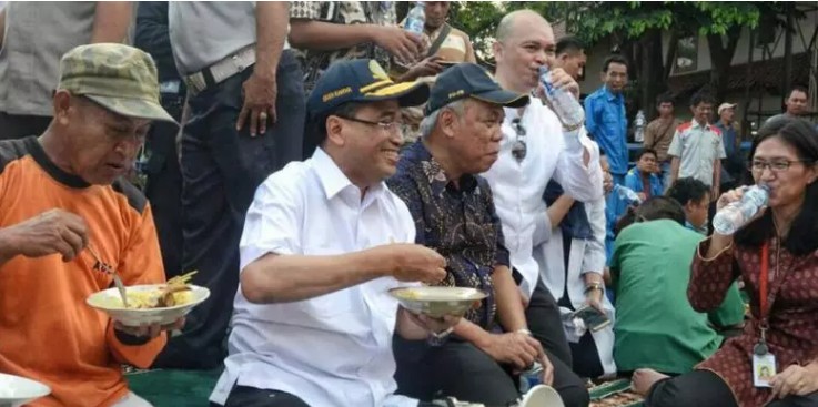 Budi dan Basuki duduk bersama dengan para sopir bus di atas tikar tanpa dipayungi terpal.