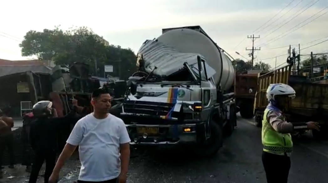 Tabrakan antara truk pengangkut air dan truk pengangkut pasir terjadi di Jalan Jamin Ginting, Desa Sugau, Kecamatan Pancu Batu