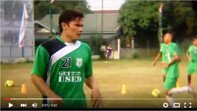 Sugiar melakukan shooting dengan cepat. Bola yang sudah diletakkan sejajar, satu persatu ditendang.